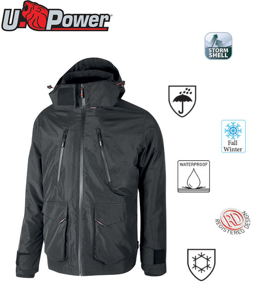 Vodootporna zimska jakna U-POWER FOREX izrađena u tehnologiji STORM SHELL. Vanjski dio jakne je vodootporan i prozračan i otporan na kišu. 2 velika prednja džepa postavljena na dnu s preklopom i kopčanjem na čičak, 2 džepa na prsima s vodootpornim patentnim zatvaračem. Središnji patentni zatvarač s poklopcem na preklop. Podesiva i odvojiva kapuljača. Podesive manšete s udobnim čičkom.