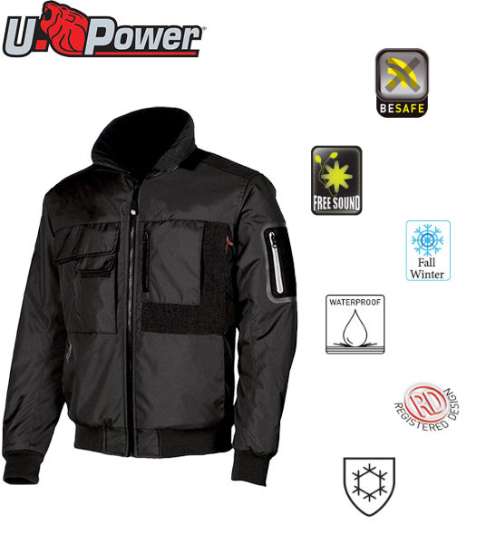 Robusna bomber zimska jakna U-POWER MATE s odvojivim rukavima, vodootporna s mikroflisom i najlonskom postavom. Veliki prednji džepovi s preklopom na čičak i patentnim zatvaračem, džep na rukavima s termo ljepljivom trakom, veliki unutarnji džep držač za tablet, džep za medije s izlazom za slušalice s tehnologijom Free Sound i Besafe tehnologijom, preklop na stražnjoj strani za označavanje robne marke.