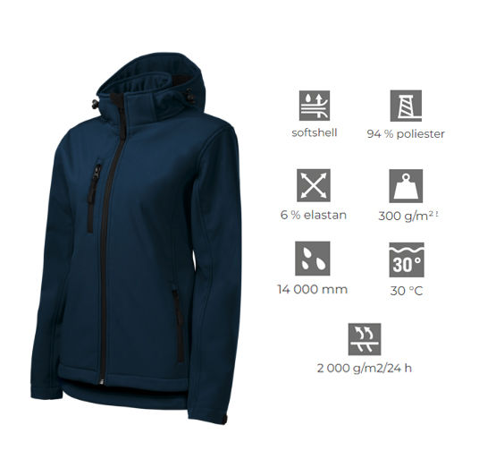 Performance ženska softshell jakna sa ugodno prijanjajućim krojem, izrađena od trostrukog poliestera sa TPU membranom. Unutarnji dio jakne čini mikro flis sa antipiling obradom.