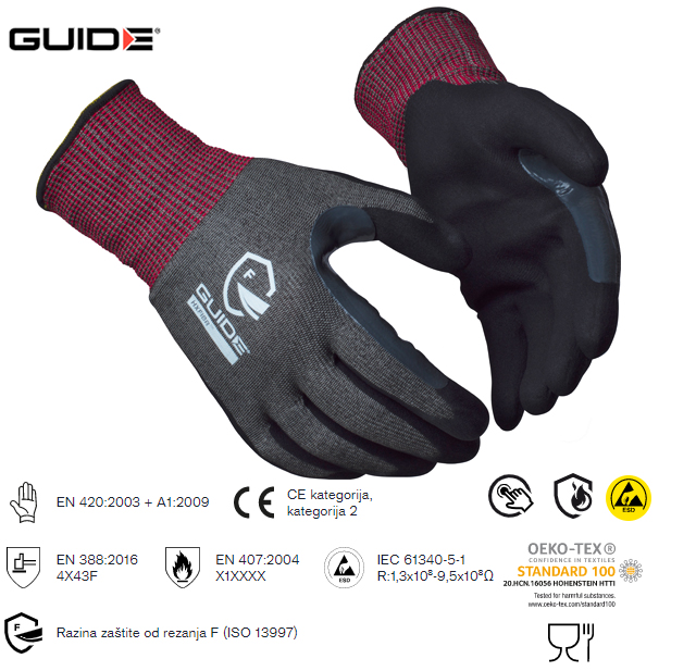 Fleksibilna, čvrsto prianjajuća radna rukavica proizvedena u Guide HXFIBR, materijalu koji pruža revolucionarnu zaštitu od posjekotina i izvrsnu taktilnu osjetljivost. Nitrilni premaz rukavica pruža dobro prianjanje. Podloga od 13 gg i dodatno pojačanje duž palca i kažiprsta. Razina zaštite od rezanja F, odobrena za kontaktnu razinu topline 1. Odobrena od ESD-a i sigurna za hranu. Oeko-Tex odobren. Ekran na dodir.