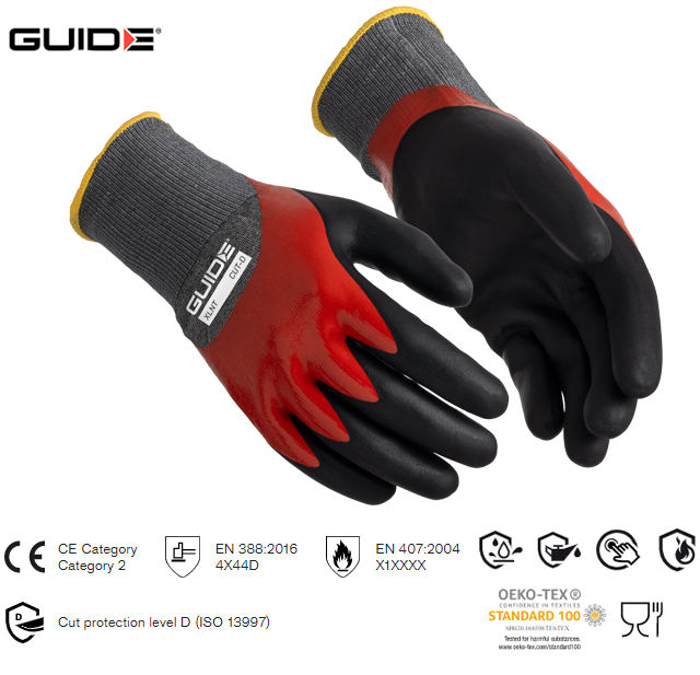 Vrlo tanka, fleksibilna radna rukavica s premazom od nitrila Guide XLNT, pruža barijeru protiv ulja i izvrsno prianjanje u suhim i uljnim okruženjima. Rukavica sa nitrilnim premazom preko cijele šake, te s dvostrukim premazom preko dlana pružaju izvrsnu zaštitu od tekućina i ulja. Sigurno za hranu i odobreno za kontaktnu razinu topline 1. Odobren Oeko-Tex. Razina zaštite od rezanja D. Zaslon osjetljiv na dodir.