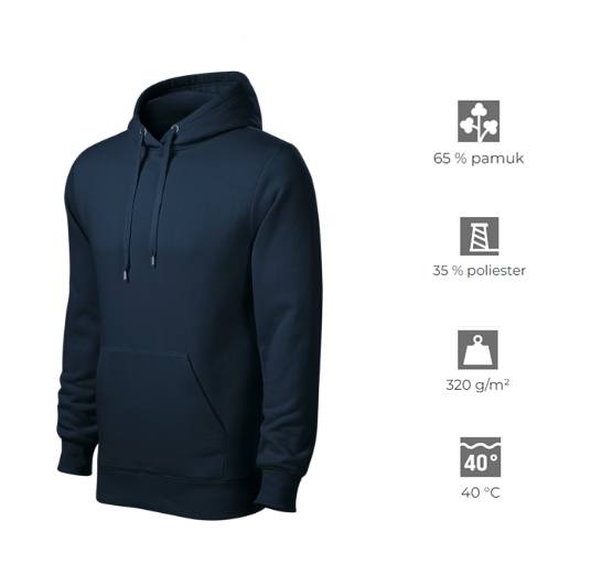 Muški gornji dio trenirke izrađene je od mekane felpe s češljanom unutrašnjom stranom koja pruža toplinu i udobnost. Klasičan ravan kroj s bočnim šavovima osigurava udobno pristajanje, dok kapuljača s podstavom i vezicom omogućuje prilagodbu. Majica ima veliki klokan džep sprijeda te rebraste manšete i donji rub s dodatkom elastana za bolju elastičnost i dugotrajnost. Idealna za rad, slobodno vrijeme i svakodnevno nošenje.