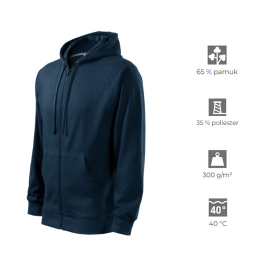 Trendy zipper je izrazito udoban gornji dio trenirke izrađen od 65 % pamuka i 35 % poliestera.