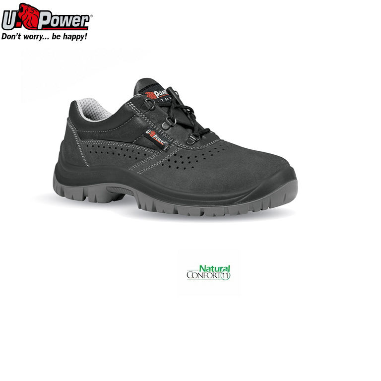 Niske zaštitne cipele iz serije Entry U Power, s gornjištem od perforirane antilop kože, čeličnom kapom, protuprobojnom, protukliznom, ergonomskom čeličnom folijom i PU/PU potplatom.